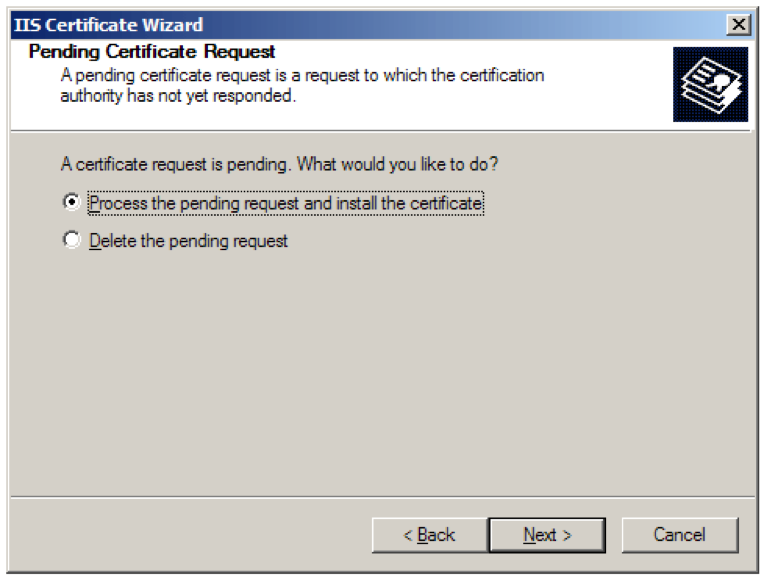 7. Chọn mục Process the Pending Request and Install the Certificatesau đó nhấn Next.