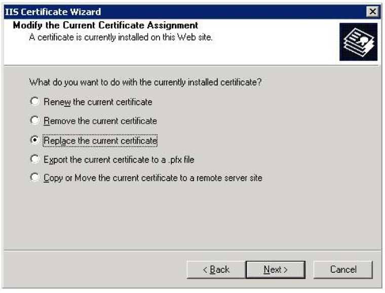 – Chọn website cũ và chọn mục “Replace current certificate”, sau đó chọn chứng thư số mới (bạn có thể để ý ngày hết hạn để tìm ra chứng thư mới).