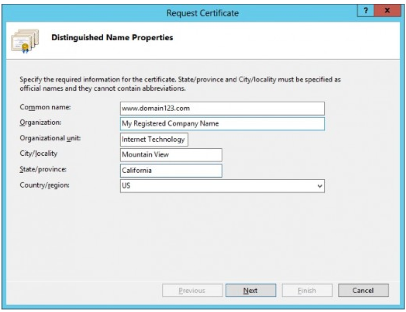 Common Name: Nhập vào tên miền chính của chứng chỉ số. Lưu ý chỉ nhập tên miền (ví dụ mail.company.com), không nhập https://